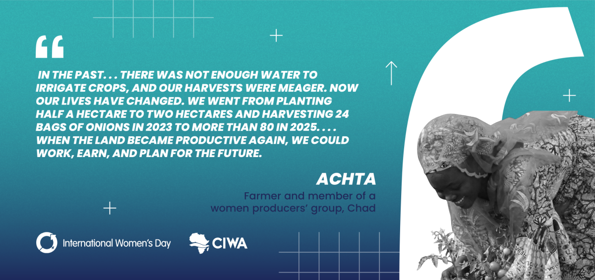 Dans une région longtemps marquée par la sécheresse et l'instabilité,Achta, agricultrice et membre d'un groupe de productrices, fait partie d'une transformation silencieuse. Grâce aux efforts de restauration des terres soutenus par la CIWA, les agricultrices récupèrent les terres dégradées, rétablissent la productivité et reconstruisent les marchés locaux.