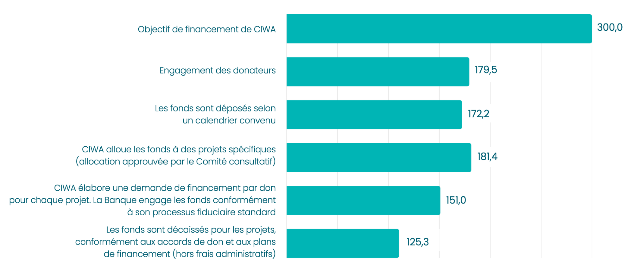 Conformément aux pratiques habituelles du Fonds fiduciaire de la Banque mondiale, les donateurs s'engagent à financer la CIWA (le montant total de l'engagement s'élève à US$179,5 millions) et les fonds sont déposés selon un calendrier convenu (le montant total des dépôts s'élève à US$172,2 millions). Dans le cadre des efforts de planification stratégique de la CIWA, des fonds ont été alloués à des projets spécifiques et à l'assistance technique (les allocations actuelles s'élèvent à 181,4 millions de dollars US) autour des grands thèmes et domaines approuvés par le comité consultatif de la CIWA.