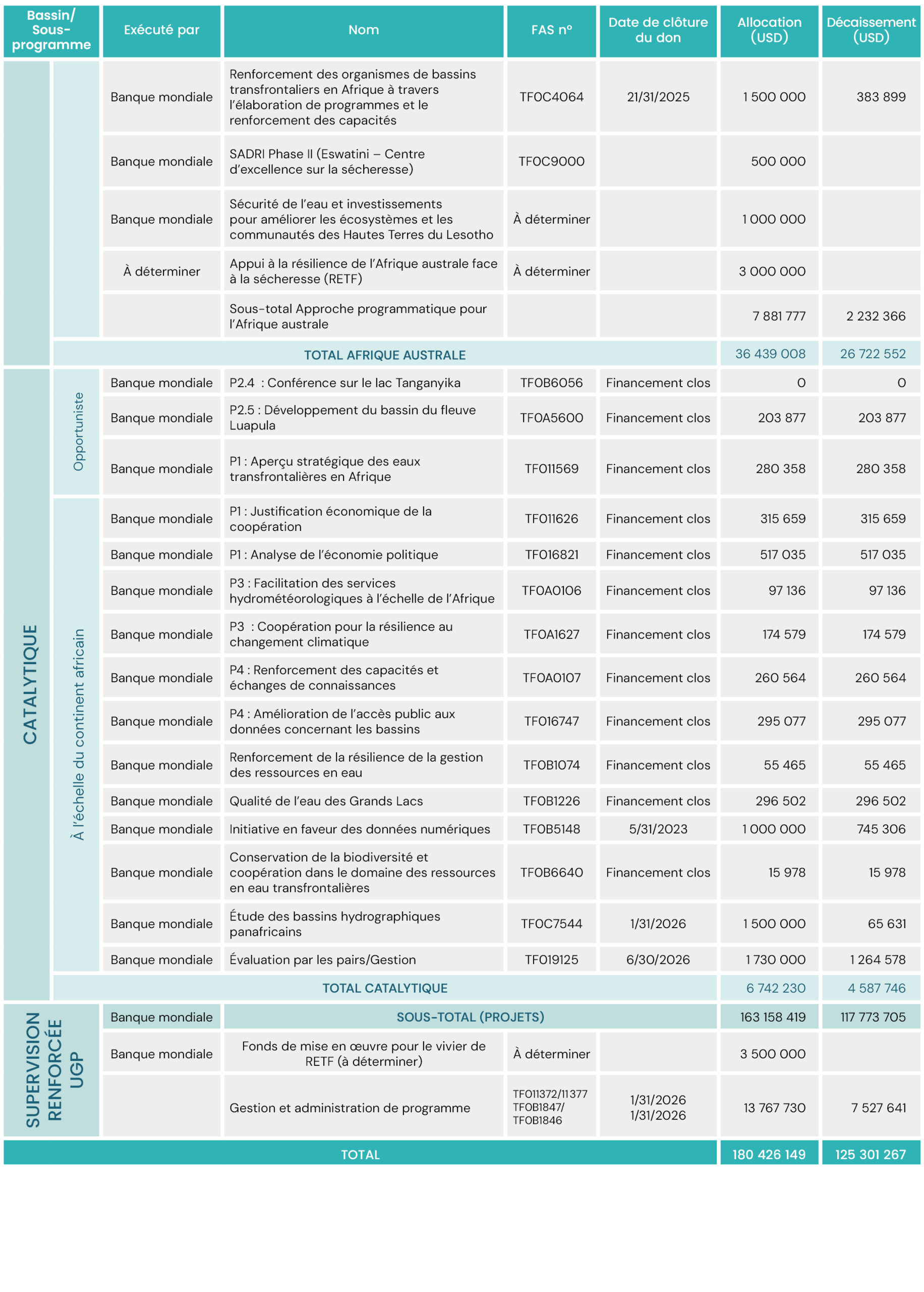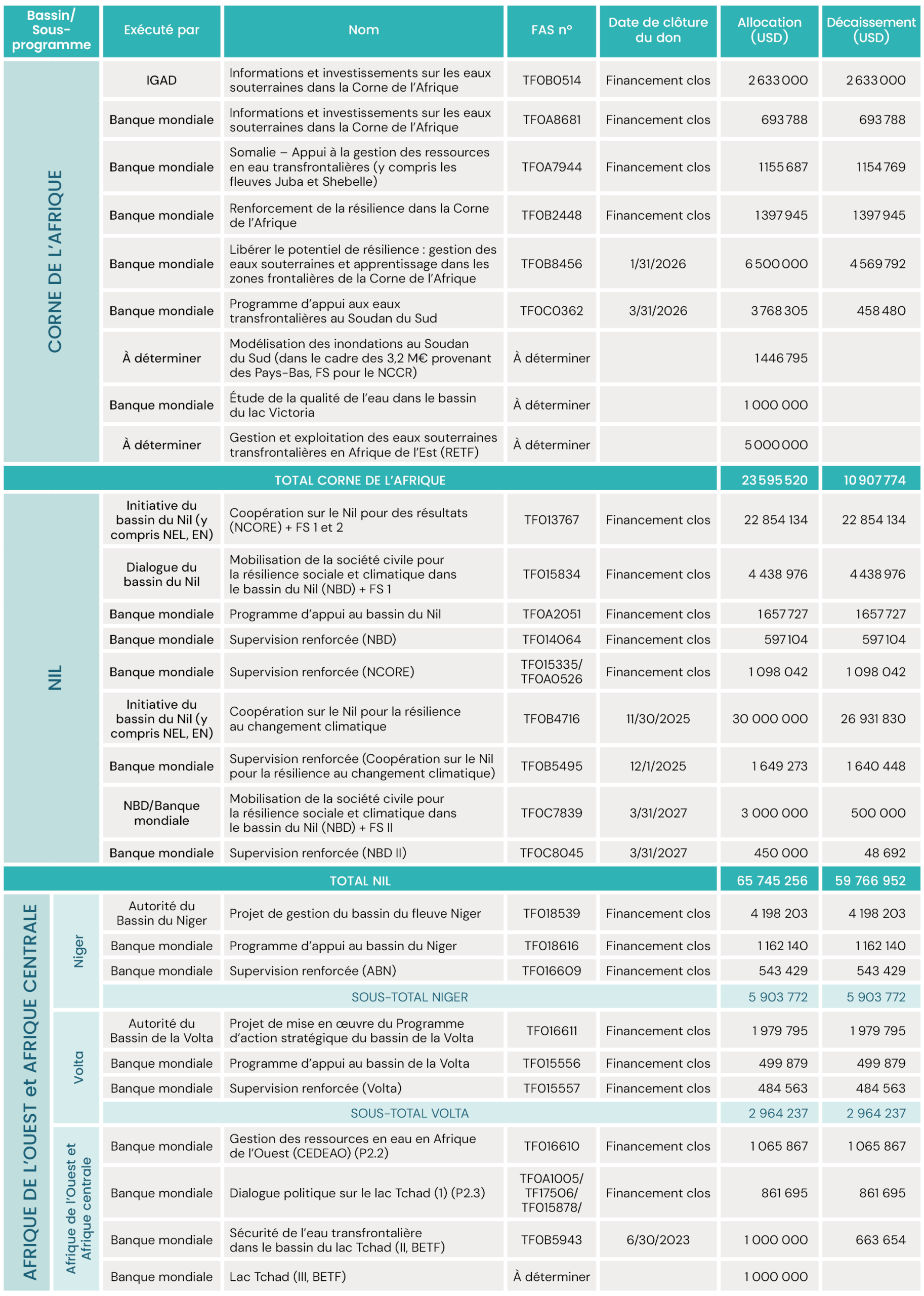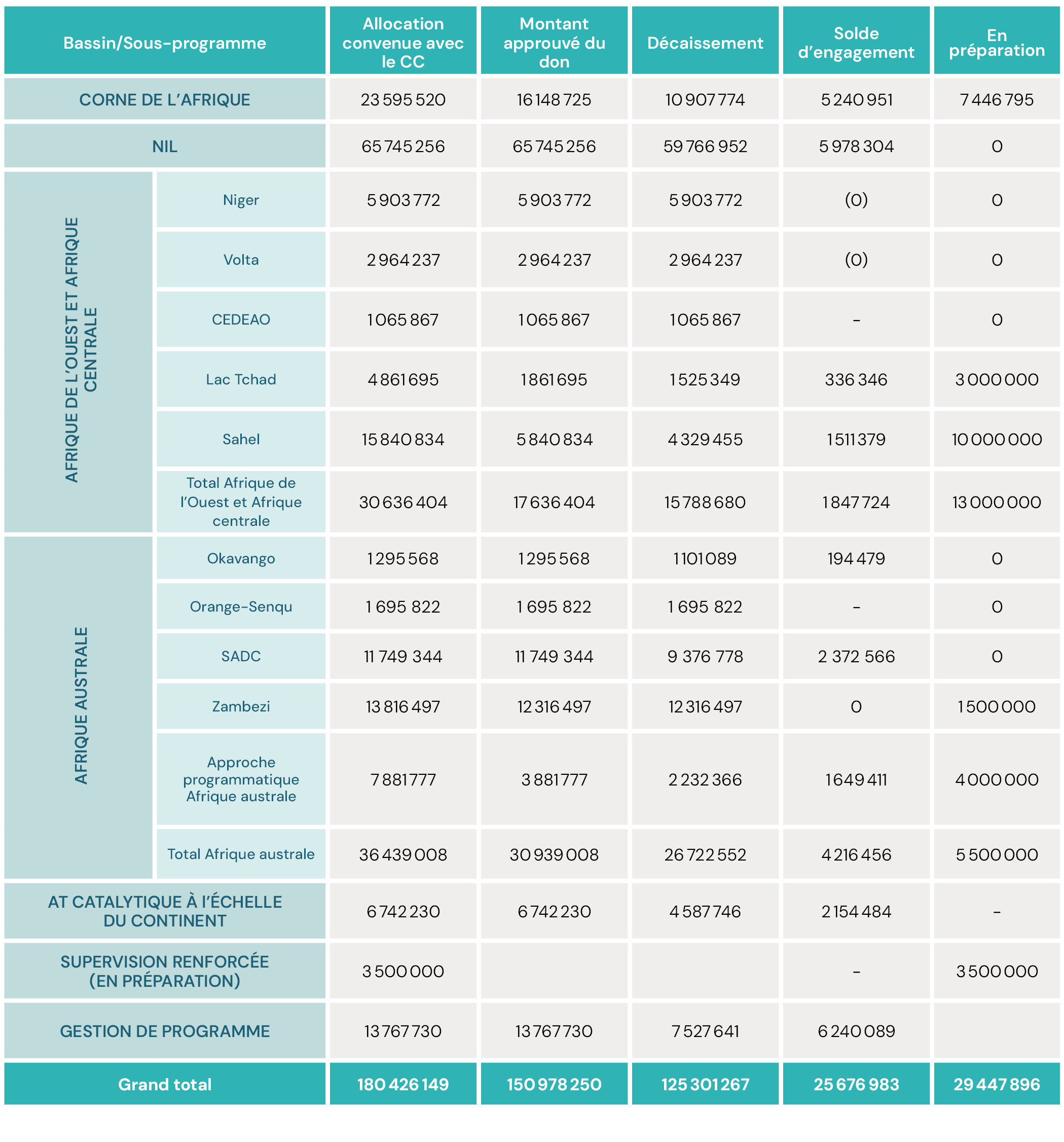 ‘L'allocation fait référence à l'approbation de l'allocation des fonds par le CA de CIWA - à la fois pour les subventions réelles et pour les allocations théoriques qui doivent encore être transférées dans les comptes d'activité de subvention. Le terme ’engagement‘ désigne la reconnaissance par les systèmes internes de la Banque mondiale que des fonds ont été affectés à un projet ou à une activité. Les fonds sont engagés lorsque la direction du fonds fiduciaire de la Banque mondiale a approuvé une demande de financement de subvention (GFR), mettant en place un engagement contractuel ou programmé qui conduit à des dépenses effectives dans le futur. Le terme ’décaissement‘ désigne le transfert de fonds du compte de subvention au compte désigné par le client après que la Banque a approuvé une demande d'investissement spécifique. Pour les subventions exécutées par la Banque, les décaissements sont des paiements effectués sur la base d'un bon de commande ou d'un contrat. Les activités ’en réserve‘ du sous-programme sont celles qui ont fait l'objet d'une approbation d'affectation conditionnelle ou qui sont soumises à l'approbation des systèmes de projets et de fonds fiduciaires de la Banque mondiale. Le développement du pipeline est en cours et peut être modifié, y compris les allocations théoriques après le 1er juillet 2025.