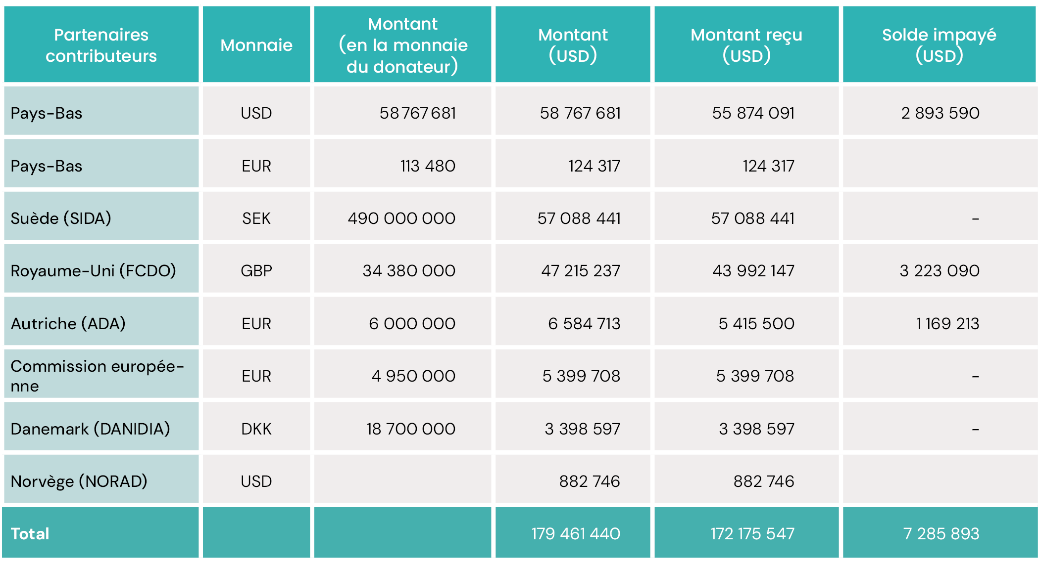 Ce calendrier peut être révisé, si nécessaire, pour répondre aux exigences de décaissement du projet. Le tableau A4.1 (ci-dessus) présente l'état des promesses et des dépôts des donateurs.