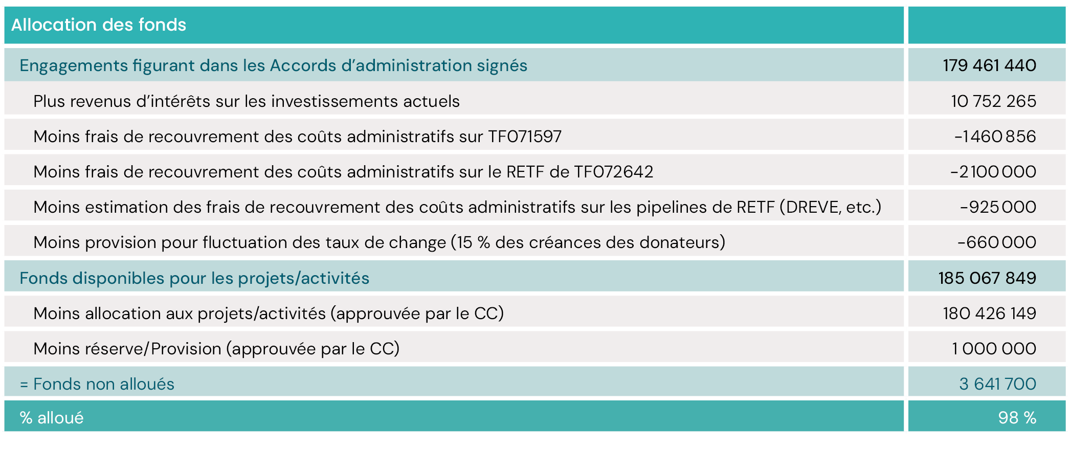 Au 30 juin 2025, $181,4 millions de dollars US ($180,4 millions de dollars US en projets et $1,0 millions de dollars US en réserve) ont été alloués à titre indicatif aux projets et activités de la CIWA.8 La majeure partie du financement de la CIWA (98 %) a été affectée à des activités en cours de préparation ou de mise en œuvre. Les fonds non alloués s'élèvent à $3,6 millions de dollars US, et la demande actuelle de soutien dépasse de loin les ressources actuelles.