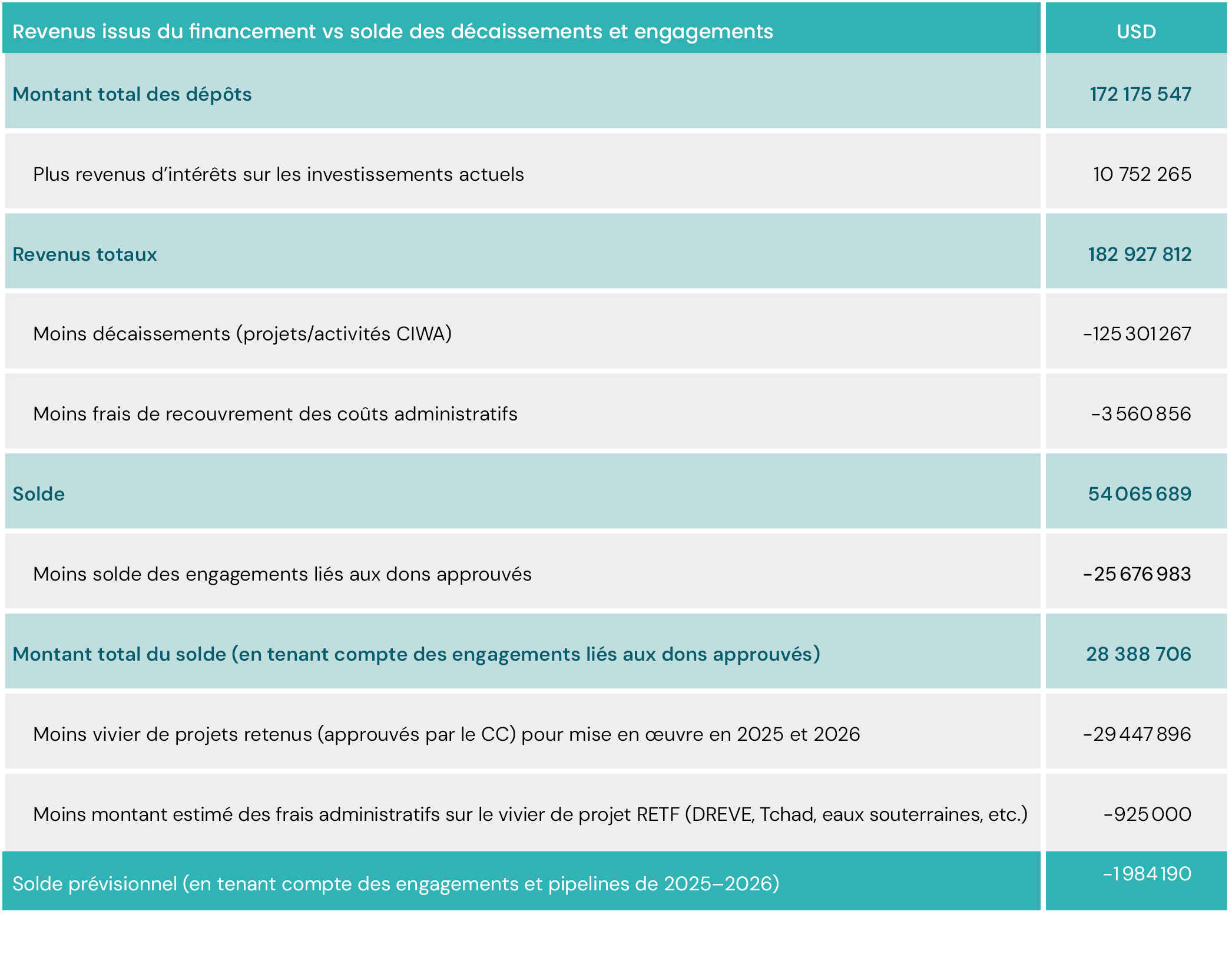 À la fin de l'exercice 25, CIWA a reçu $182,9 millions de dollars, dont $172,2 millions de dollars en paiements de donateurs et $10,7 millions de dollars en revenus d'investissement du compte CIWA. Les décaissements cumulés s'élèvent à 128,8 millions de dollars US, dont 125,3 millions de dollars US pour les projets et 3,5 millions de dollars US pour les frais administratifs. Le rythme des décaissements s'est accéléré au cours de l'exercice 25. Le solde des engagements en matière de subventions s'élève à 25,6 millions de dollars US. Le tableau A4.4 présente le solde disponible sur le compte CIWA, qui est d'environ 54 millions de dollars US, soit un solde de - 1 million de dollars US si l'on tient compte du solde des engagements actuels de 25 millions de dollars US et d'un montant supplémentaire de 29,4 millions de dollars US dans la seconde moitié de l'exercice 26 et de l'exercice 27.