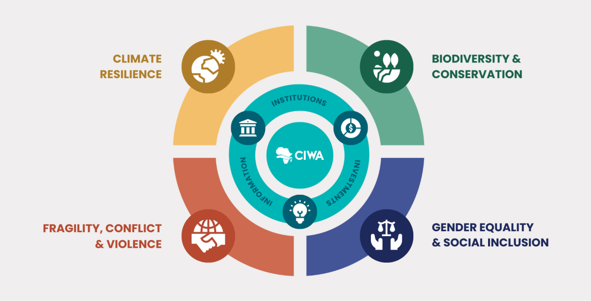 In CIWA 2.0’s new Theory of Change, Fragility Conflict and Violence (FCV), Gender Equality and Social Inclusion (GESI), Biodiversity and Conservation, and Climate Resilience are the pathways to achieving impact on the three Is.
